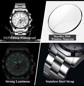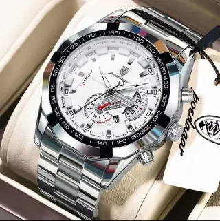 Elegante reloj con esfera blanca y detalles plateados, perfecto para el día a día o para ocasiones especiales. - Diseño con cronómetro. - Correa de eslabones plateada. - Bisel con marcadores de tiempo. - botones son decorativos