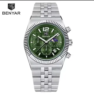 Elegante reloj BENYAR para hombre con un diseño moderno y sofisticado. - Esfera de color verde vibrante. - Correa y caja de acero inoxidable plateado. - Detalles en la esfera que añaden un toque distintivo.