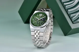 Elegante reloj de pulsera con un diseño moderno y llamativo. - Esfera en tono verde con detalles plateados. - Correa de eslabones plateada. - Bisel giratorio en color verde.