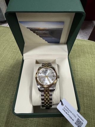 Elegante reloj Fredric de la colección Sapphire, con un diseño bicolor que combina tonos dorados y plateados. Presentado en su caja original. - Esfera con números romanos. - Cristal de zafiro. - Movimiento de cuarzo. - Acero inoxidable. - Precio original 250€ - Precio negociable