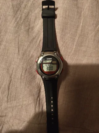 Reloj Casio modelo W-211-1BVES con detalles en rojo. - Correa de caucho negra. - Bisel plateado con detalles rojos.