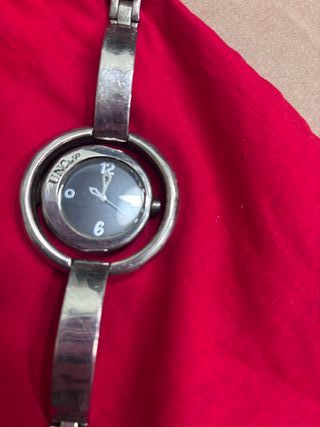 Elegante reloj de la marca Uno de 50 con un diseño moderno y sofisticado. Funciona perfectamente. Solo hay que cambiarle la pila. - Esfera redonda con detalles en plateado. - Brazalete de eslabones metálicos. - Cierre de seguridad. La plata tiene los roces típicos del uso, pero está bien cuidado, como se puede apreciar en las fotos.