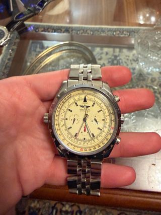 Elegante reloj Breitling con esfera beige y detalles plateados. Al brazalete se le tiene que poner un pasador - Diseño clásico y sofisticado. - Correa de metal. - Bisel con escala.