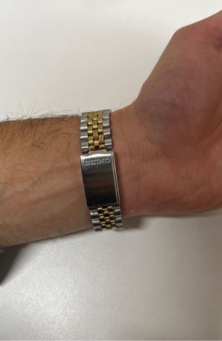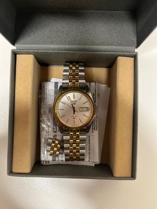 Reloj Seiko 5 con un diseño de 36mm clásico y elegante, combinando tonos dorados y plateados. - Bisel estriado. - Correa de eslabones mixtos. - Ventana de día y fecha.