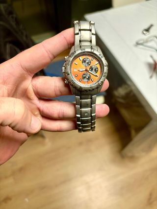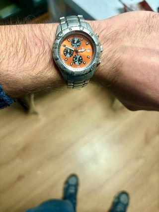 Elegante reloj cronógrafo con esfera naranja y detalles plateados. Reloj de coleccion. Dispongo de videos para una mejor visualizacion - Diseño deportivo y moderno. - Correa de eslabones plateada. - Tres subesferas para funciones de cronógrafo. - Resistente al agua 100 metros
