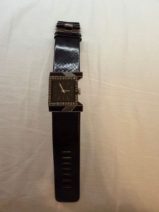 Reloj de pulsera con un diseño moderno y elegante. - Correa de material sintético en color negro. - Esfera redonda con detalles en plateado. - Hebilla metálica para ajuste.