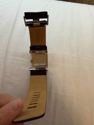 Reloj de pulsera con correa de cuero negra y detalles plateados. Con numeros y 3 esferas en blanco - Diseño rectangular. - Correa de cuero. - Hebilla metálica. Como nuevo, apenas usado