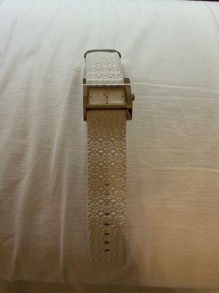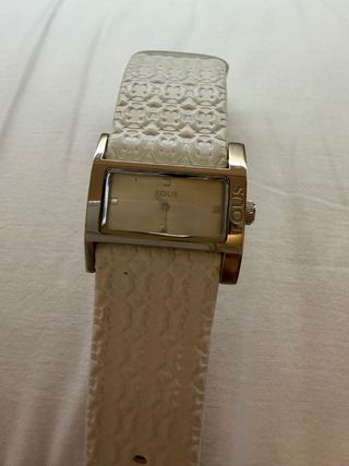 Elegante reloj Tous con correa blanca y detalles plateados. - Diseño rectangular. - Correa con relieve. - Esfera clara. No tiene pila. Entrega en mano.