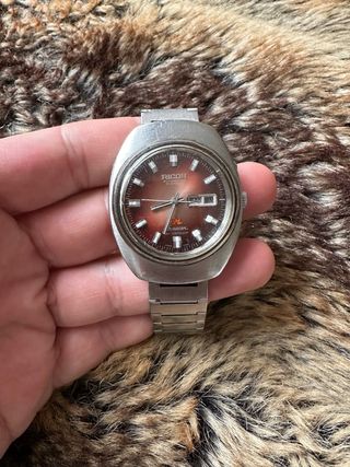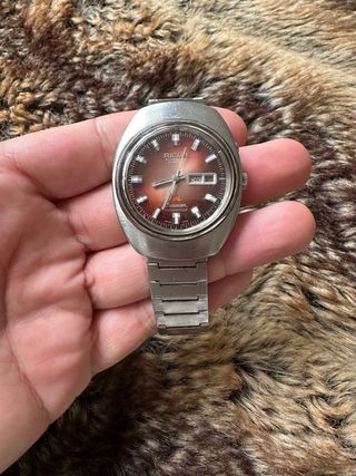 Reloj de pulsera Ricoh con esfera degradada en tonos rojizos y detalles plateados. - Mecanismo automático. - Indicador de día de la semana y fecha. - Brazalete de eslabones metálicos. - Funciona perfectamente solo necesita Limpieza.