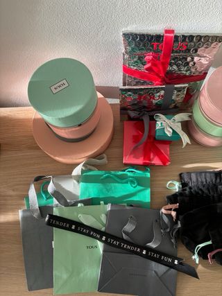Cajas y bolsas para regalo de Tous en varios tamaños y colores: - espuma para pendientes … 0,5€ - caja redonda mediana (10cm aprox) .. 4€ - caja grande ... 8€ - caja reloj cartón rectangular ... 7€ - caja reloj plástico duro rectangular … 12€ - bolsa pequeña ... 2,5€ - bolsa grande ... 4,5€ - caja pequeña turquesa edicion especial ... 4,5€ - Caja Eugenia by Tous edicion especial de 9 x 9 x 3 ... 5€ - bolsa plastificada plateada mediana ... 3,5 € - bolsa plastificada plateada grande ... 5,5€ - saco tela negro pequeño 1,5€ - saco tela negro mediano 2,5€ - saco tela negro grande 3,5€ - sobre garantia distintos colores (rosa, verde,