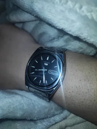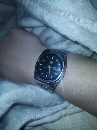 Reloj Seiko 5 de estilo vintage con esfera negra y detalles plateados. Automático, revisado y funcionando perfecto. - Diseño clásico y elegante. - Correa de metal. - Ventana de día y fecha.