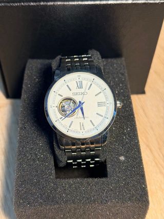 Reloj Seiko Presage 4R38-00P0 con movimiento automático. - Con garantía japonesa y todos sus eslabones. - En perfecto estado. - Esfera blanca con detalles plateados. - Ventana de exhibición del mecanismo. - Correa de eslabones plateada. Seiko Presage SARY047