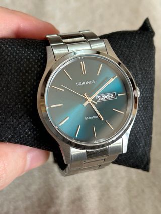 Elegante reloj Sekonda con una esfera de color verde intenso y detalles plateados. En perfectas condiciones, no tiene pila, pero funciona. Envío rápido y bien protegido. - Correa de eslabones plateada. - Esfera con acabado degradado. - Indicador de día de la semana y fecha en español y en ingles. - Resistencia al agua de 50 metros.