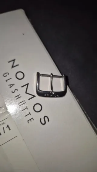 Hebilla de repuesto original para reloj de 18mm. Valdría para correa de tela de 18/19mm de Nomos u otra de piel de 18mm en el bucle. - Diseño elegante en color plata. - Detalle de logo en la parte frontal.