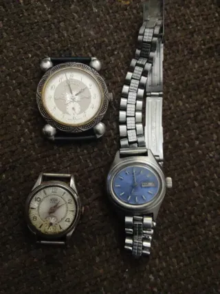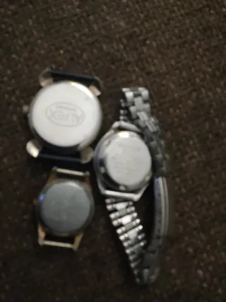 Conjunto de tres relojes con diferentes diseños. - Un reloj con esfera blanca y detalles plateados. - Un reloj con esfera azul y correa plateada. - Un reloj con esfera clara y detalles metálicos.