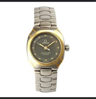 Elegante reloj Omega Seamaster Titane con detalles en oro y plata. - Esfera gris. - Bisel dorado. - Brazalete de eslabones en tono plateado y dorado. -Muñecafina