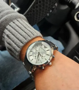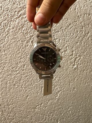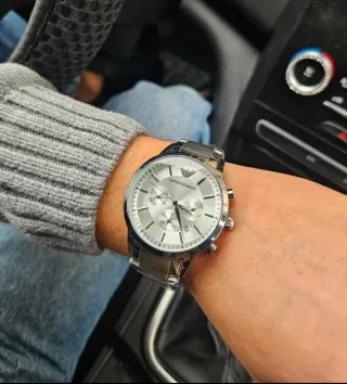 Muy elegante y masculino Elegante reloj Emporio Armani con esfera plateada y detalles blancos. - Nuevo con películas protectoras y caja. - Diseño de cronógrafo. - Correa de acero inoxidable. - Indicador de fecha. Escucho ofertas.