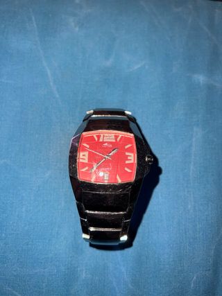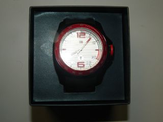 Reloj de pulsera con un diseño deportivo y moderno. No tiene pila, pero funciona perfectamente. Esta nuevo sin uso. - Correa de caucho negra. - Bisel y detalles en color rojo. - Esfera con índices y manecillas plateadas.