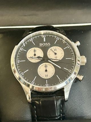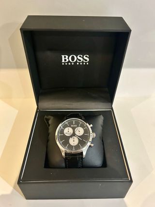 producto original. con pila. Elegante reloj BOSS para hombre con diseño cronógrafo. - Esfera negra con detalles plateados. - Correa de piel negra. - Caja de acero inoxidable plateada.