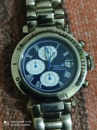 Elegante reloj Cartier con esfera azul y detalles plateados. Un accesorio sofisticado para cualquier ocasión. - Diseño de cronógrafo. - Resistente al agua.