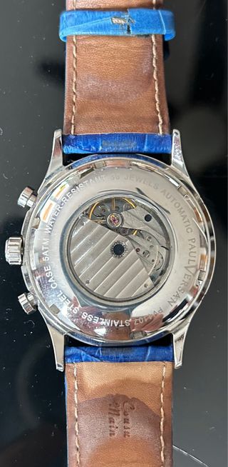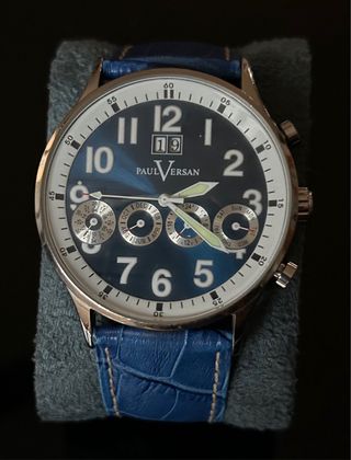 Elegante reloj Paul Versan con correa azul. - Esfera azul con detalles plateados. - Correa de piel azul con pespuntes blancos. - Cierre de hebilla plateado.