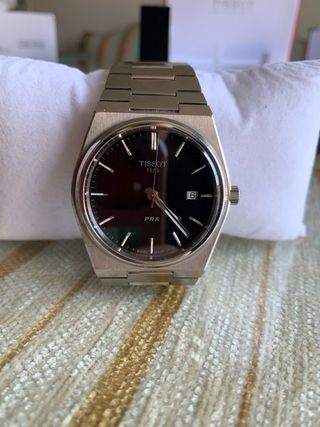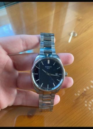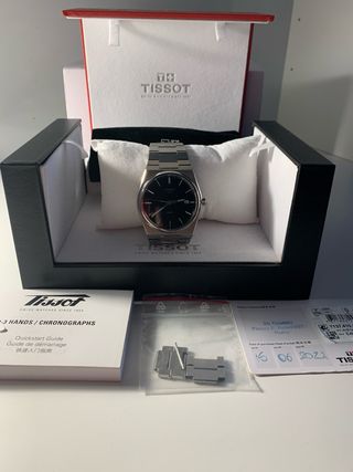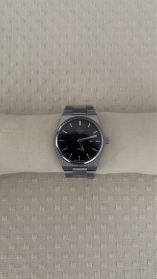 Reloj Tissot PRX con esfera negra y detalles plateados. - Diseño elegante y moderno. - Correa de eslabones plateada. - Ventana de fecha. Muy buen estado con alguños arañazos , contiene TODO