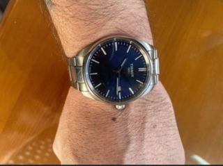 Elegante reloj Tissot con esfera azul y detalles plateados. - Diseño moderno y sofisticado. - Correa de metal. - Bisel liso.
