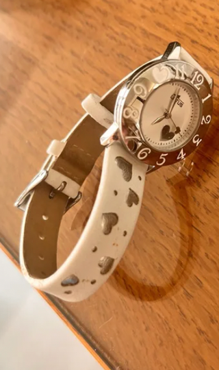Elegante reloj de la marca Lotus con un diseño encantador. - Esfera blanca con detalles en forma de corazón. - Correa blanca con estampado de corazones. - Bisel plateado con números decorativos.
