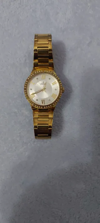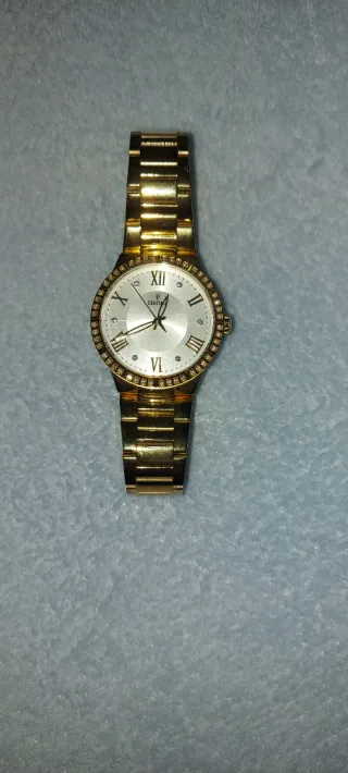Elegante reloj Festina con detalles brillantes. - Esfera plateada con números romanos. - Bisel adornado con pequeñas piedras. - Brazalete de acero inoxidable dorado. - Esfera nácar