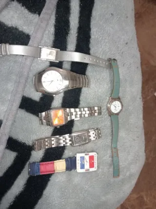 Conjunto de correas de reloj de diferentes materiales y acabados. - Correa de caucho negra con hebilla metálica. - Correa de malla metálica plateada. - Correa de piel marrón con estampado. - Correa de metal dorada. - Correa de metal plateada con eslabones.todas sin usar