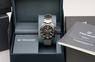 Reloj TAG Heuer con caja y brazalete de acero inoxidable. Presenta una esfera negra con detalles plateados y bisel. Casi nuevo, sin ningún rasguño, incluye caja y tarjeta de garantía