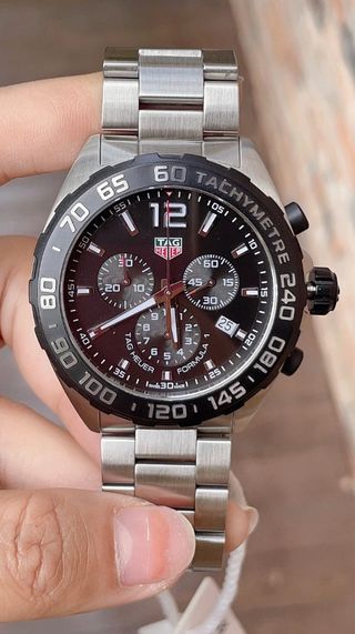 Reloj TAG Heuer Formula 1 con esfera naranja y detalles plateados. - Bisel negro con números. - Correa de eslabones plateados. - cuenta con caja y eslabones adicionales