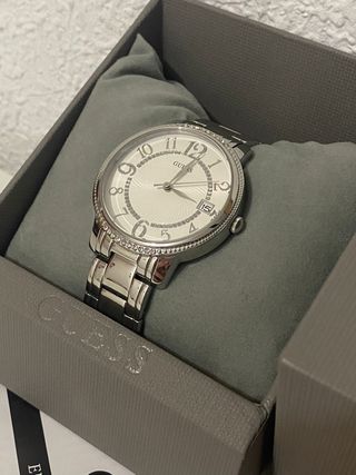 Elegante reloj de Guess para mujer con un diseño sofisticado. - Esfera blanca con detalles plateados. - Bisel adornado con pedrería - Correa de eslabones plateada.