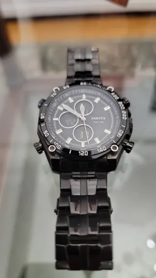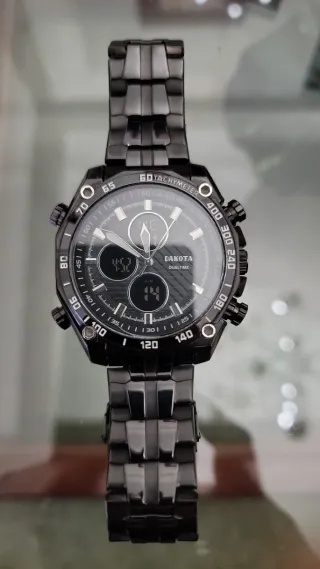 Reloj Dakota con diseño moderno y elegante. - Correa de metal. - Esfera con cronógrafo y detalles plateados. - Indicadores de hora dual.