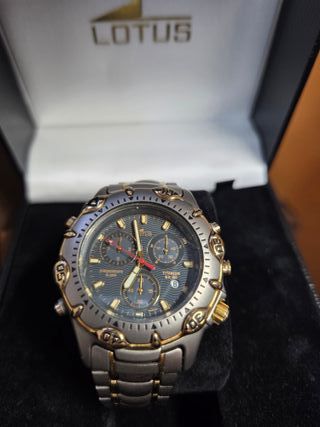 Reloj Lotus con caja y brazalete de titanio dorado y plateado. - Mod. 9665. Muy apreciado. - Mecanismo Miyota 3s10. - Funciona perfectamente. - Caja y brazalete de titanio. - Se entrega con caja original. - Cronógrafo y alarma. - Se aprecia un leve rasguño a las 2 #titanium