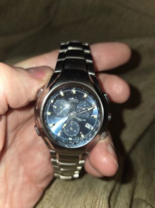 Reloj Lotus de titanio con esfera azul y detalles plateados. - Caja y brazalete de titanio. - Miyota 3s10 - Cronógrafo y alarma - Caja original - Funciona perfectamente. # Titanium