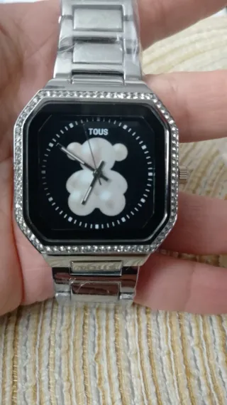 Elegante reloj con un diseño moderno. - Esfera negra. - Bisel con pedrería. - Brazalete plateado. - Detalle de oso en la esfera.