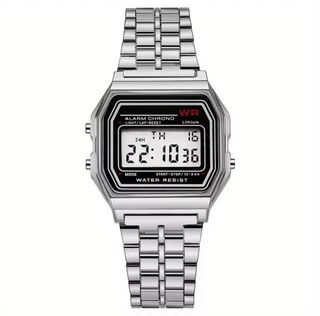 Reloj digital con acabado plateado y pantalla negra. - Diseño moderno y elegante. - Correa metálica ajustable. - Resistente al agua.