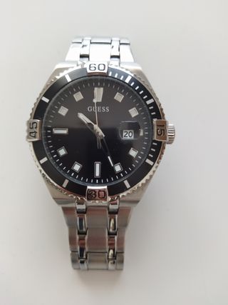 Reloj de pulsera de la marca Guess. Impecable estado. Esfera de cristal negro-plateado. Cierre de seguridad a presión plegable. Correa de acero inoxidable. Analógico para Unisex Adulto.
