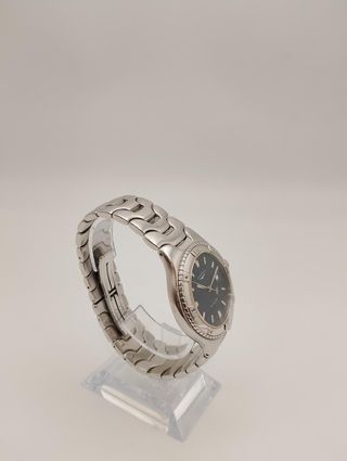 Reloj TAG Heuer con esfera azul y detalles plateados. - Bisel giratorio con marcadores. - Correa de metal. - Cierre desplegable.