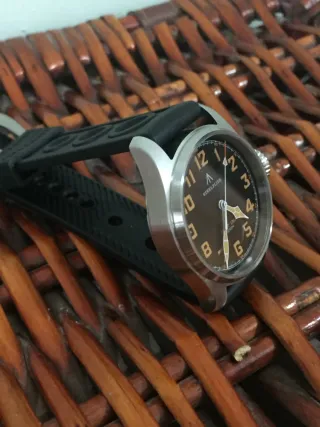 Reloj deportivo de la marca Marea con esfera negra y números grandes de fácil lectura. Estética tipo "Diver" con correa de silicona negra muy cómoda. Pila nueva, funcionando perfectamente.