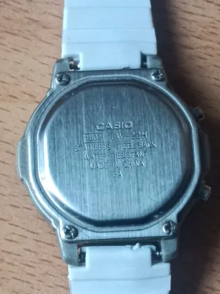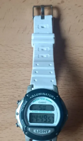 Reloj Casio con correa blanca y detalles plateados. Resistente al agua hasta 50 metros. - Función de cronógrafo y alarma. - Iluminador para ver la hora en la oscuridad. - Pantalla digital.