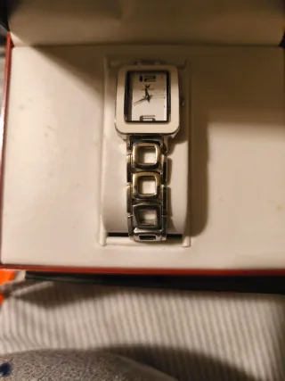 Reloj de la marca Colmar. Tiene fondo blanco y motivos plateados. La caja es rectangular y color plata como la correa. Apenas usado, se ha cambiado la pila porque estaba parado.