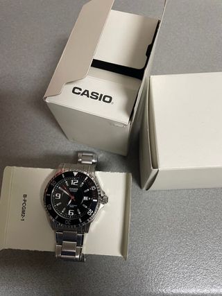 Reloj Casio con resistencia al agua de 50 metros. - Correa de metal plateada. - Esfera negra. - Cierre de seguridad.