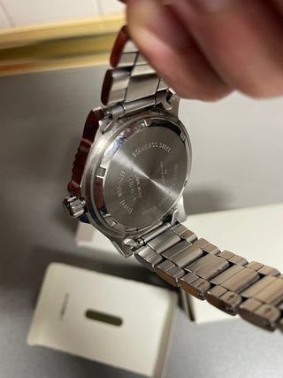 Reloj azul y plateado en caja