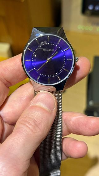 Elegante reloj de pulsera nuevo a estrenar, color azul tirando a morado segun le de la luz. - Esfera de color azul intenso. - Correa de malla plateada. - Caja metálica. Sin caja.