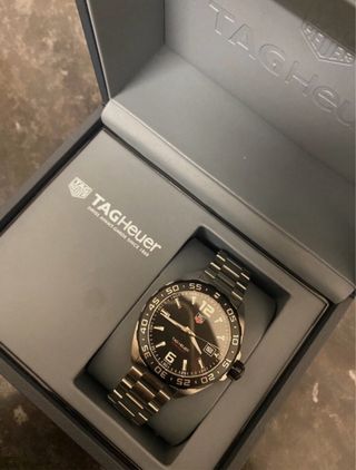 Elegante reloj TAG Heuer con caja y brazalete de acero inoxidable. Presenta una esfera negra con detalles plateados y un bisel giratorio. - Caja y brazalete de acero inoxidable. - Esfera negra con marcadores de hora plateados. - Bisel giratorio unidireccional. - Cierre desplegable con pulsadores.