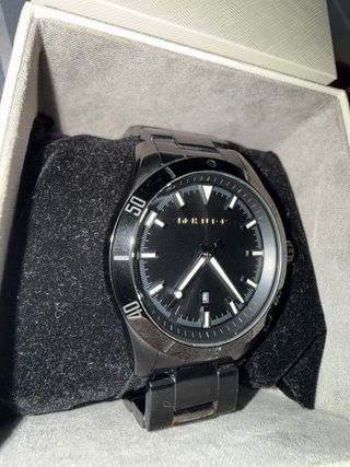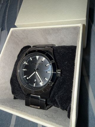- Cierre de seguridad - Esfera en tono negro. - Detalles en plateado. - Correa de eslabones. - Puesto/usado en tres ocasiones.