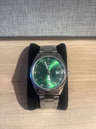 - Esfera de color verde vibrante. - Correa de malla plateada. - Caja de presentación incluida.