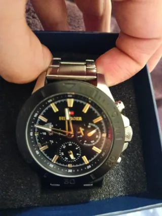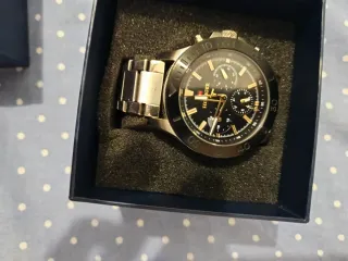 Reloj de pulsera con diseño deportivo y elegante. - Esfera negra con detalles en dorado y plateado. - Correa de metal. - Bisel con números. - Resistente al agua WR 100M.